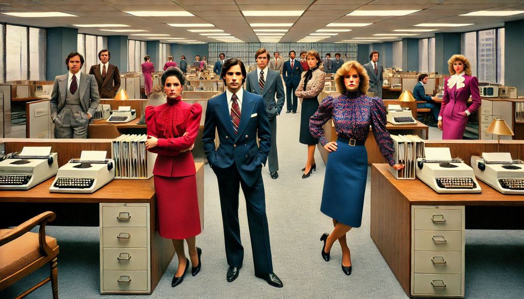The 1980s had a formal and hierarchical office culture, particularly in industries like finance, law, and corporate management. Dress codes were strict, with men wearing suits and ties and women donning tailored dresses or skirts with blouses. Power dressing, epitomized by padded shoulders and bold colors, was a hallmark of the era, reflecting a focus on professionalism and ambition.