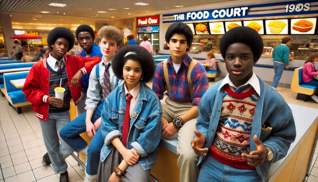 The mall food court was its own world—bright, loud, and busy. Teenagers shared giant sodas and greasy pizza slices. Parents sat and sipped coffee while their kids devoured soft pretzels. Workers on lunch breaks grabbed Styrofoam containers of Chinese food or chicken nuggets from neon-lit counters. No one was on a phone. Conversations happened face to face. People watched other people, not screens.